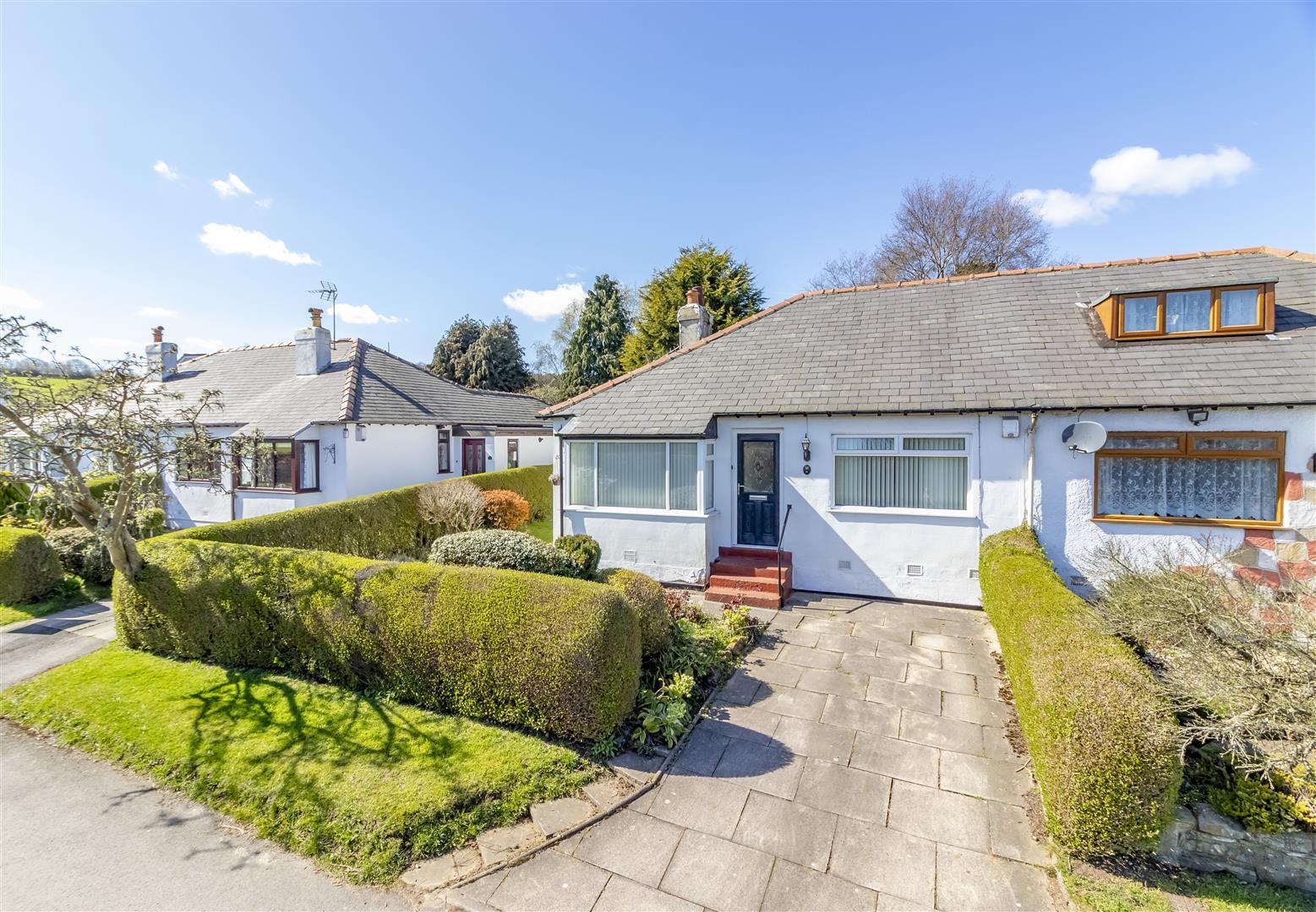 A great opportunity to acquire a true semi-detached bungalow which enjoys a delightful semi-rural cul-de-sac setting, along a private road and close to open fields in The Green Belt. A situation ideal for those with outdoor pursuits and dog walking especially being so close to and enjoying level access onto Otley’s Chevin Forest Park. The accommodation, which offers great improvement potential to suit individuals’ needs has UPVC sealed double glazed windows and is entered by a central reception hall. The front facing lounge with a square bay window enjoying a private aspect has an electric fireplace provision and electric panelled radiator. A folding internal door leads to the dining/living room with stone fireplace surround, electric fire provision and sliding patio window opening to the rear conservatory which overlooks and opens to the delightful westerly facing rear and side garden undoubtedly a most attractive feature with private lawn, established boundary shrubs and a shed for storage. The kitchen with built in cupboards and oven/hob is accessed from both the dining/living room and conservatory. There are two double bedrooms, one with built-in wardrobes and both served by a white three-piece suite bathroom with tiled walls and includes the step-in shower. Whilst mains gas has not been installed to the bungalow, it is understood that is available on Park Mount.